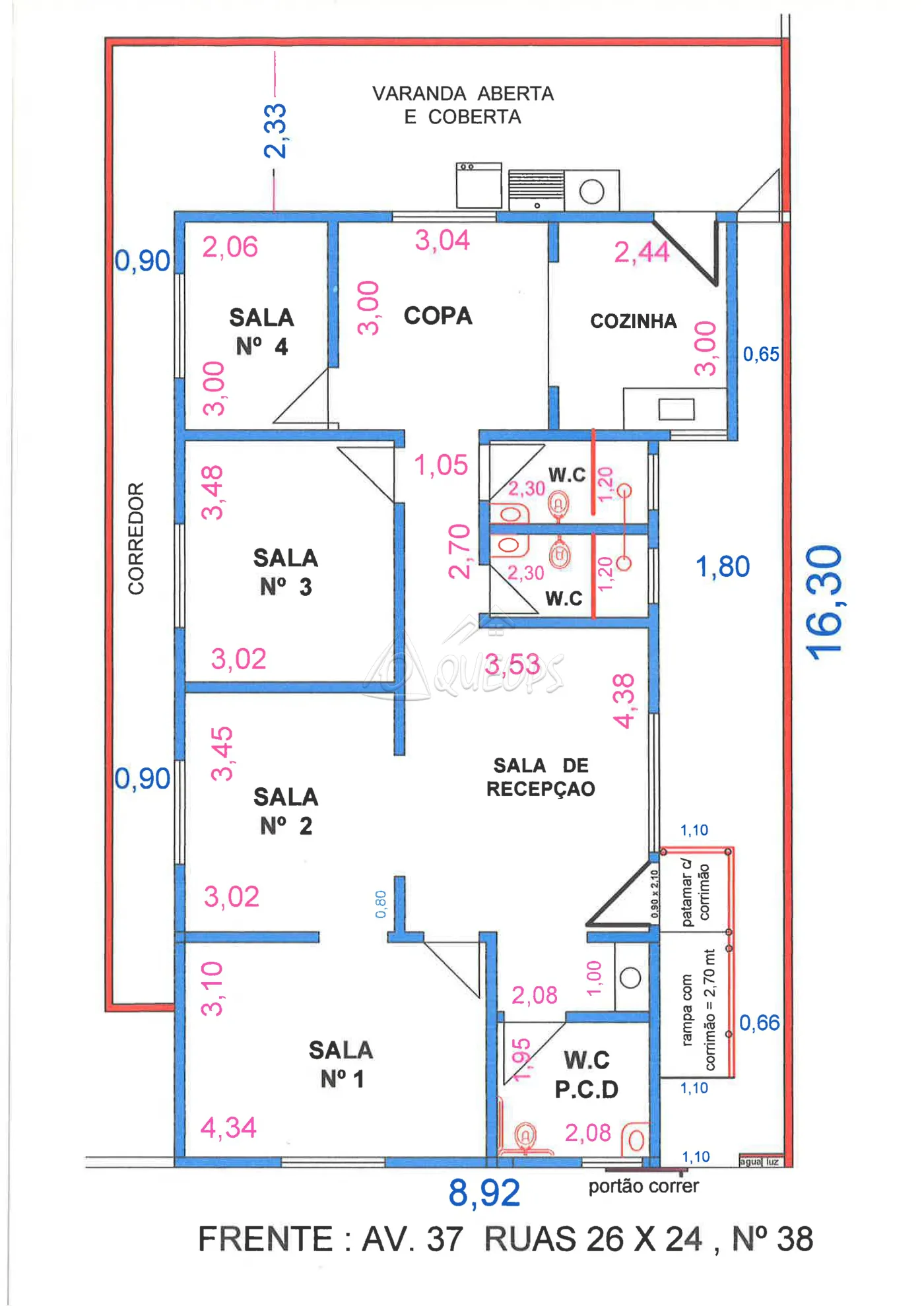 4 salas comerciais, recepção, 3 wc sociais sendo um com acessibilidade, copa, cozinha, varanda.