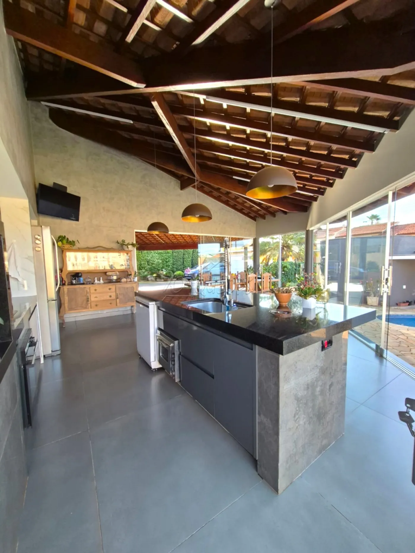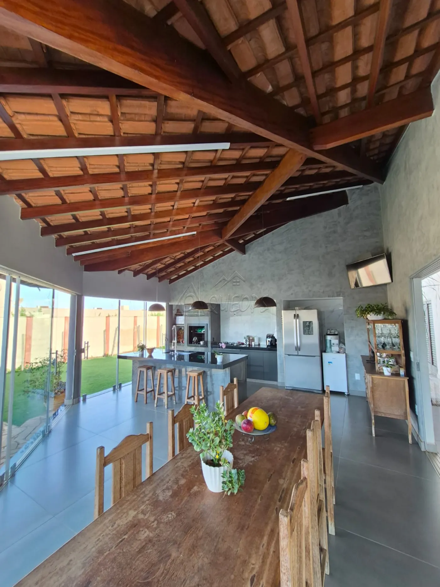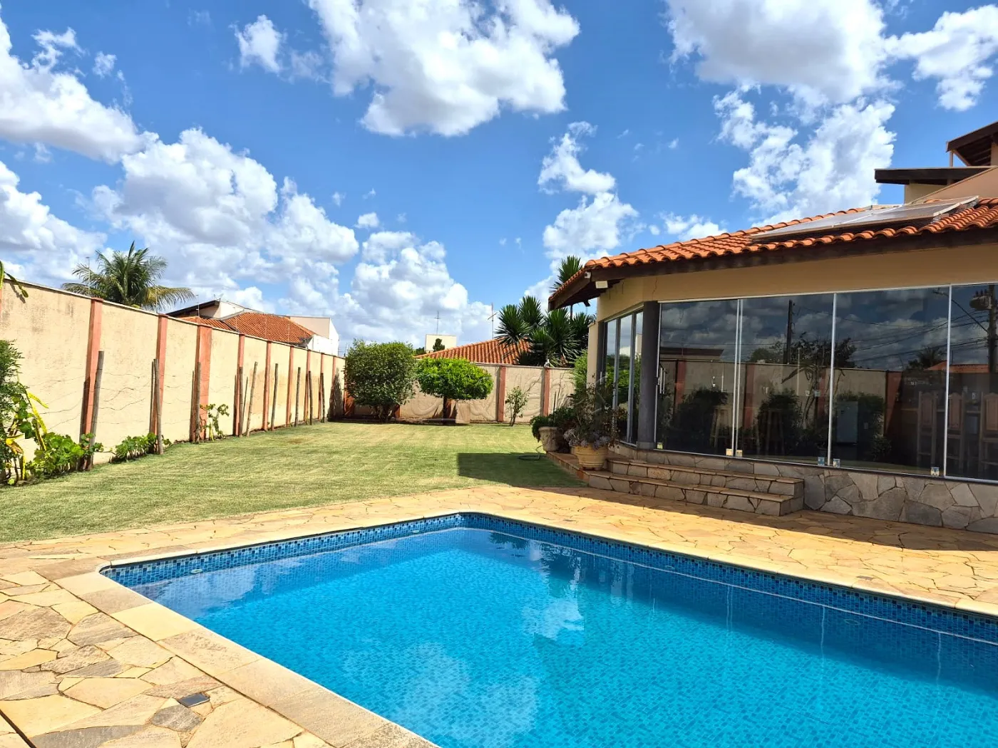 4 dormitórios (sendo 1 suíte com hidromassagem e armário e 2 suítes com armários e 1 dormitório), sala de TV, sala de estar, cozinha americana planejada com cooktop, coifa, lavabo, lavanderia fechada com armários, varanda gourmet com planejados, ilha, churrasqueira, cooktop, forno, wc externo, piscina com barzinho, quintal gramado com árvores frutíferas, jardinagem frontal, garagem para 6 carros sendo 3 cobertos, piso frio e assoalho, teto de laje, portão eletrônico, cerca elétrica, área do terreno 879,00 m² sendo área construída 302,76 m².